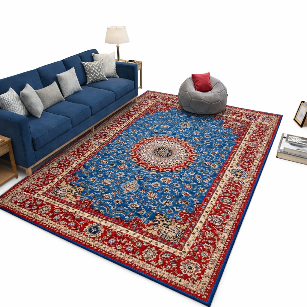 The Royal Azure Medallion Rug brings a touch of elegance and timeless charm to your living space. Featuring a rich blue base with a striking red border and an intricate medallion pattern, this rug is inspired by classic Persian designs while perfectly complementing modern interiors. Its soft texture provides comfortable underfoot feel, while the durable construction ensures long-lasting beauty and everyday usability.