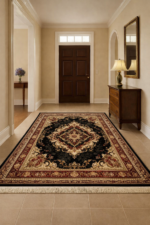 Ye carpet ek classic Persian-inspired design ke saath aata hai, jisme center medallion aur rich floral patterns use kiye gaye hain. Deep black base ke upar gold, ivory aur maroon tones isko luxury aur royal look dete hain. Border detailing kaafi fine aur elegant hai, jo hallway, living room ya entrance area ko instant premium upgrade de deti hai.