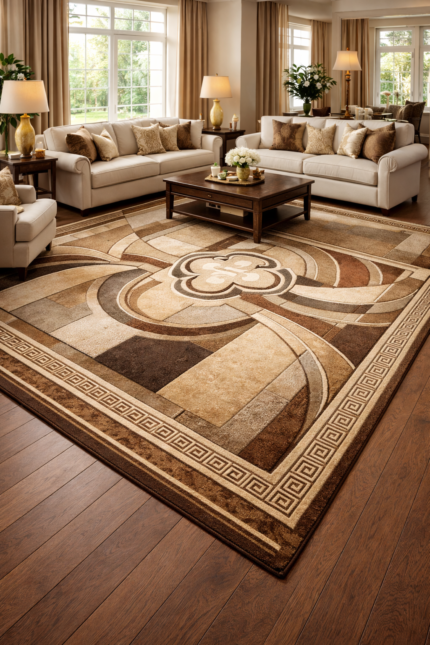 Its large size makes it perfect for placing in front of a sofa and TV setup, creating a warm, balanced, and stylish look for your room. The smooth texture feels comfortable underfoot, while the detailed border and central design give your space a premium, sophisticated vibe.