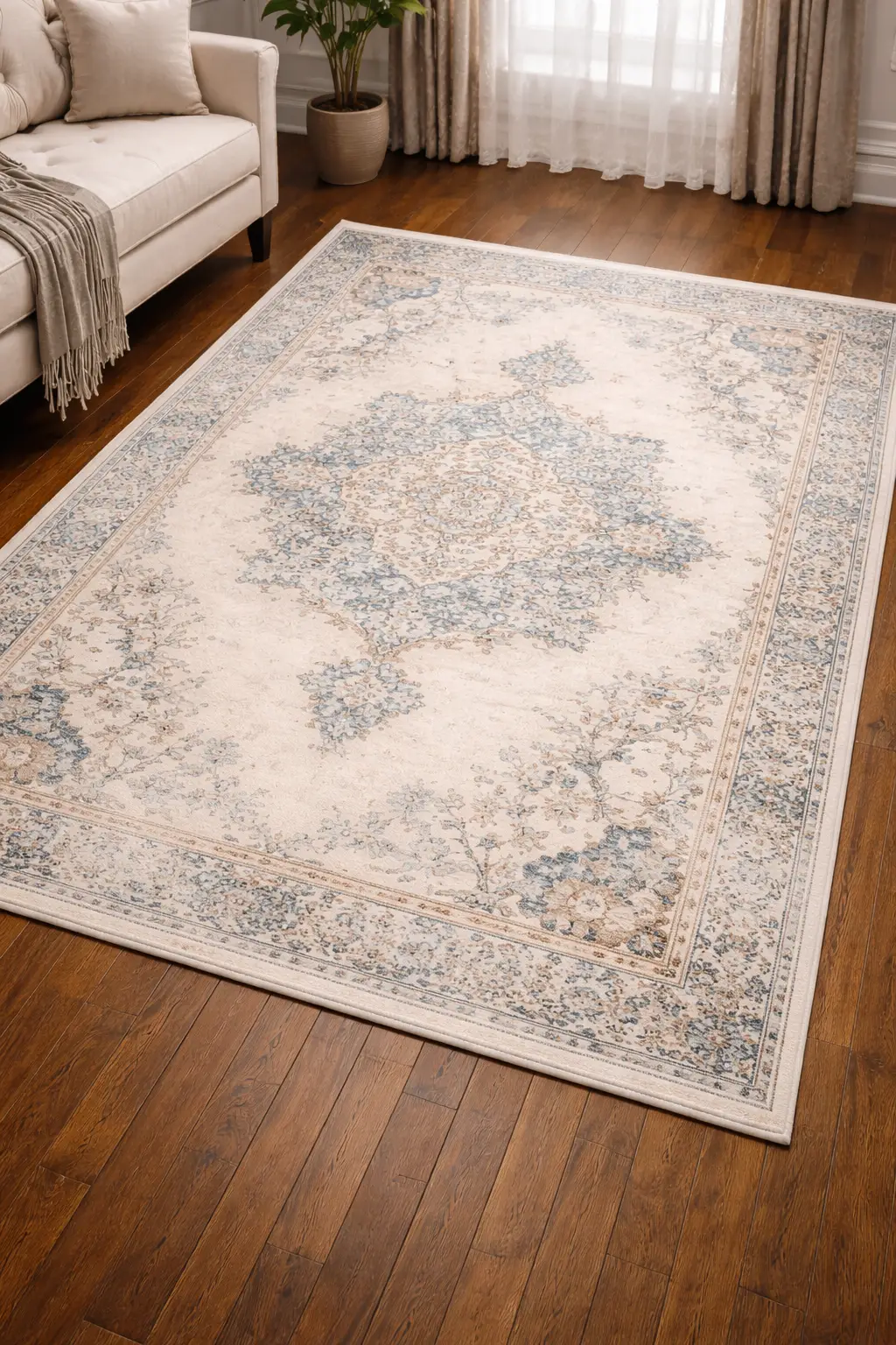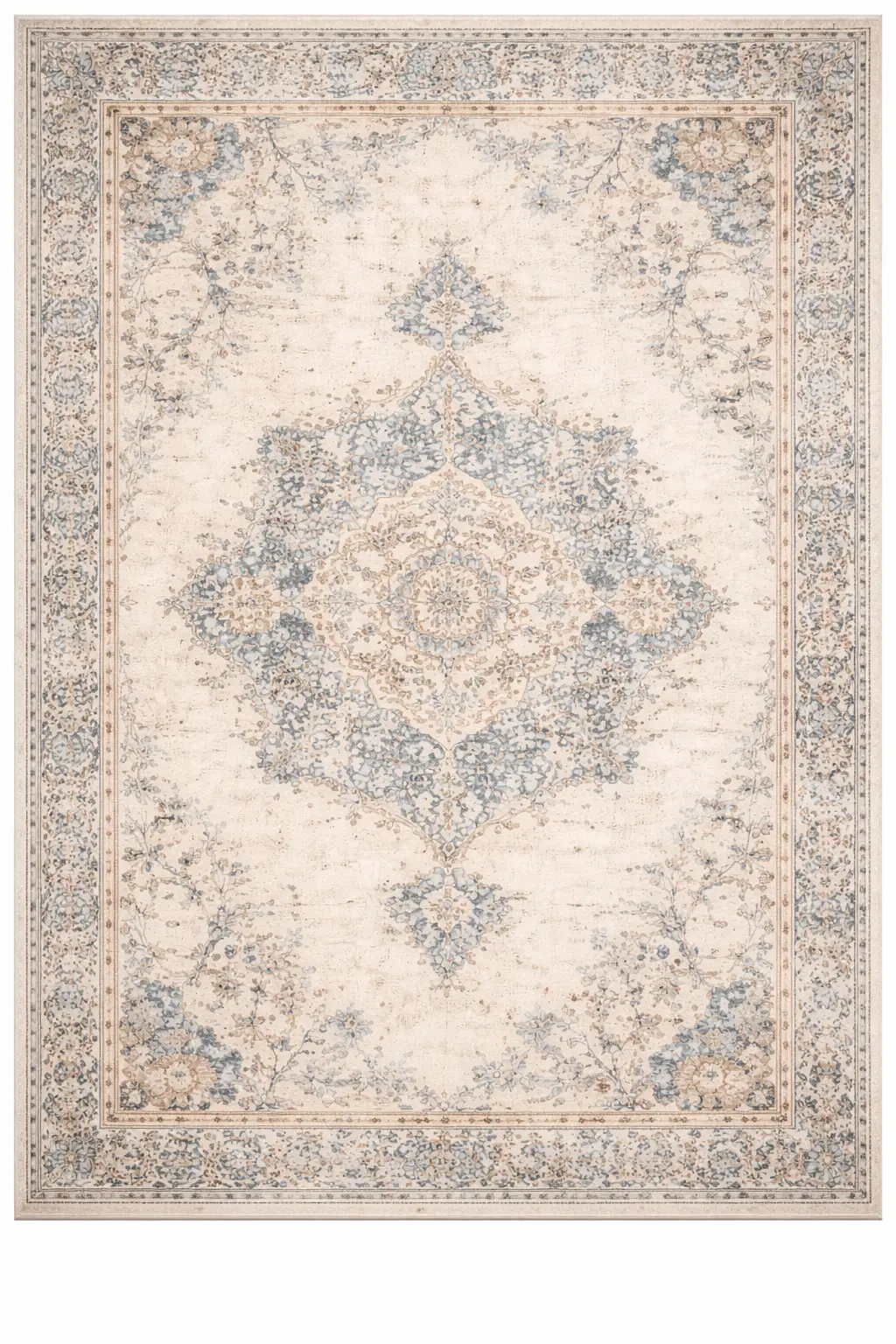 The Serene Vintage Medallion Synthetic Carpet is designed to bring a calm, elegant, and timeless look to your home. Featuring a beautifully faded medallion pattern with soft floral details, this carpet creates a subtle vintage charm while keeping a modern, clean feel. The soothing shades of beige, ivory, and light blue make it easy to match with both contemporary and classic interiors.